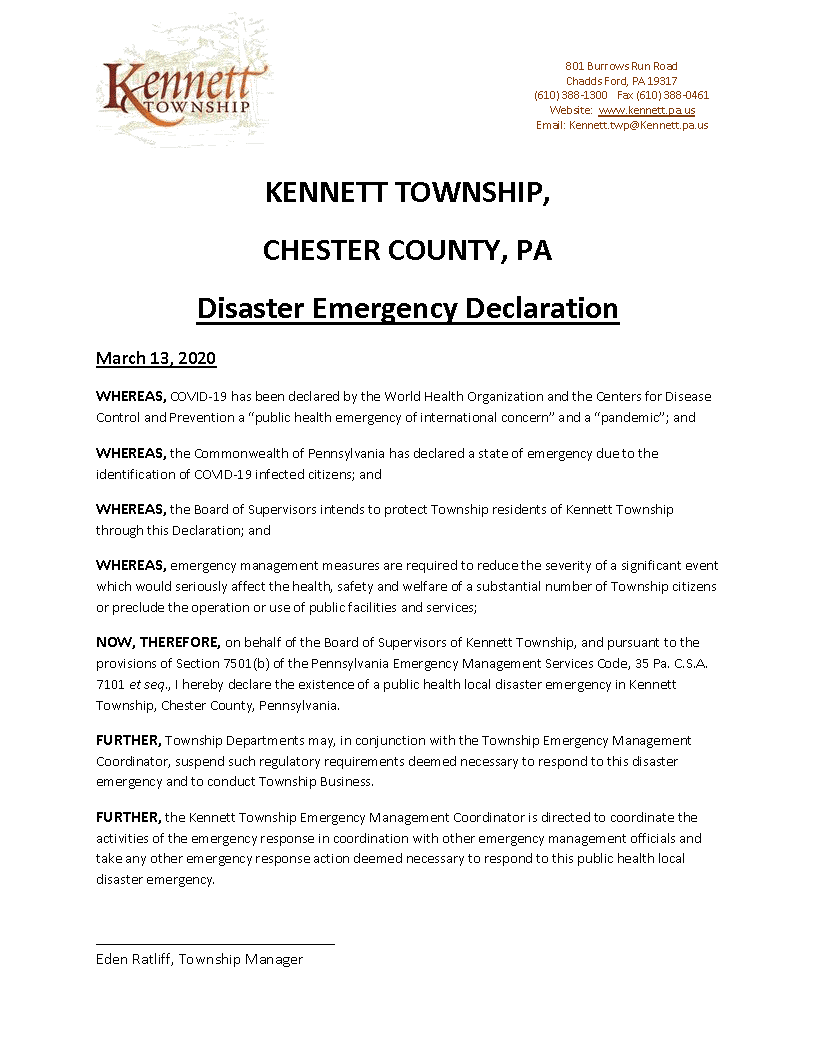 KENNETT TOWNSHIP, CHESTER COUNTY, PA Disaster Emergency Declaration